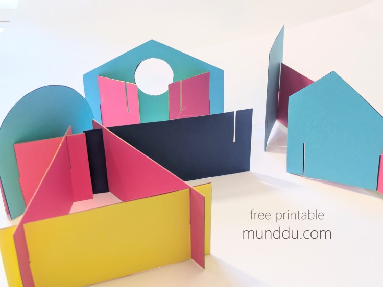 - ๐ Download the free template from Munddu.com and print it on different color cardstock or regular paper. Cardstock works best for sturdier buildings.
