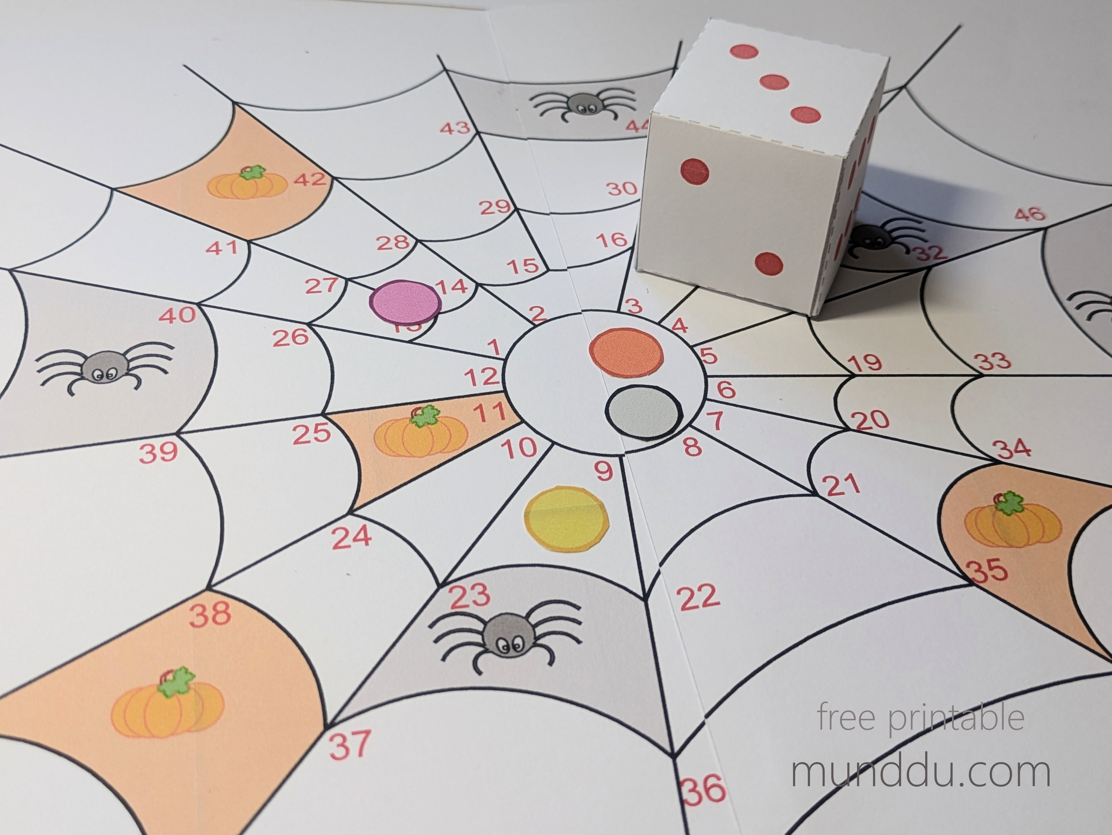 Each player takes turns rolling the dice and moving along the spiderweb path. The first to reach the final pumpkin wins!